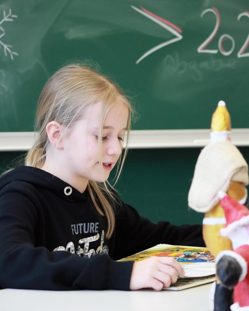 „Es hat großen Spaß gemacht!“, berichtete Emma Rottkemper, neben Malena Walpuski eine der beiden Klassensiegerinnen aus der 6A. Dies bestätigten auch die anderen Klassensieger: Larissa Mefus und Emma Schlösser aus der 6B, Joas Bergmann und Melina Meier aus der 6C und die bereits erwähnten Siegerinnen aus der Klasse 6D. In zwei Runden ging es darum, den besten Lesevortrag zu ermitteln. Die Jury achtete auf Lesetechnik, Interpretation und Textstellenauswahl. Schließlich konnten die sechs Jurymitglieder aus den Deutsch-Leistungskursen der Q1, Stefanie Hager aus dem Team der Stadtbücherei Warendorf und Sonja Konert als Deutschlehrerin Judith Görzen als der diesjährigen Schulsiegerin gratulieren. Ihr folgten Mia Afhüppe und Larissa Mefus auf dem zweiten und dritten Platz. Die Koordinatorin des Wettbewerbs, Deutschlehrerin Imke Schmidt, die Tische und Wände nach gemütlicher, weihnachtlicher Art geschmückt hatte, überreichte ihnen Urkunden und Buchgeschenke.